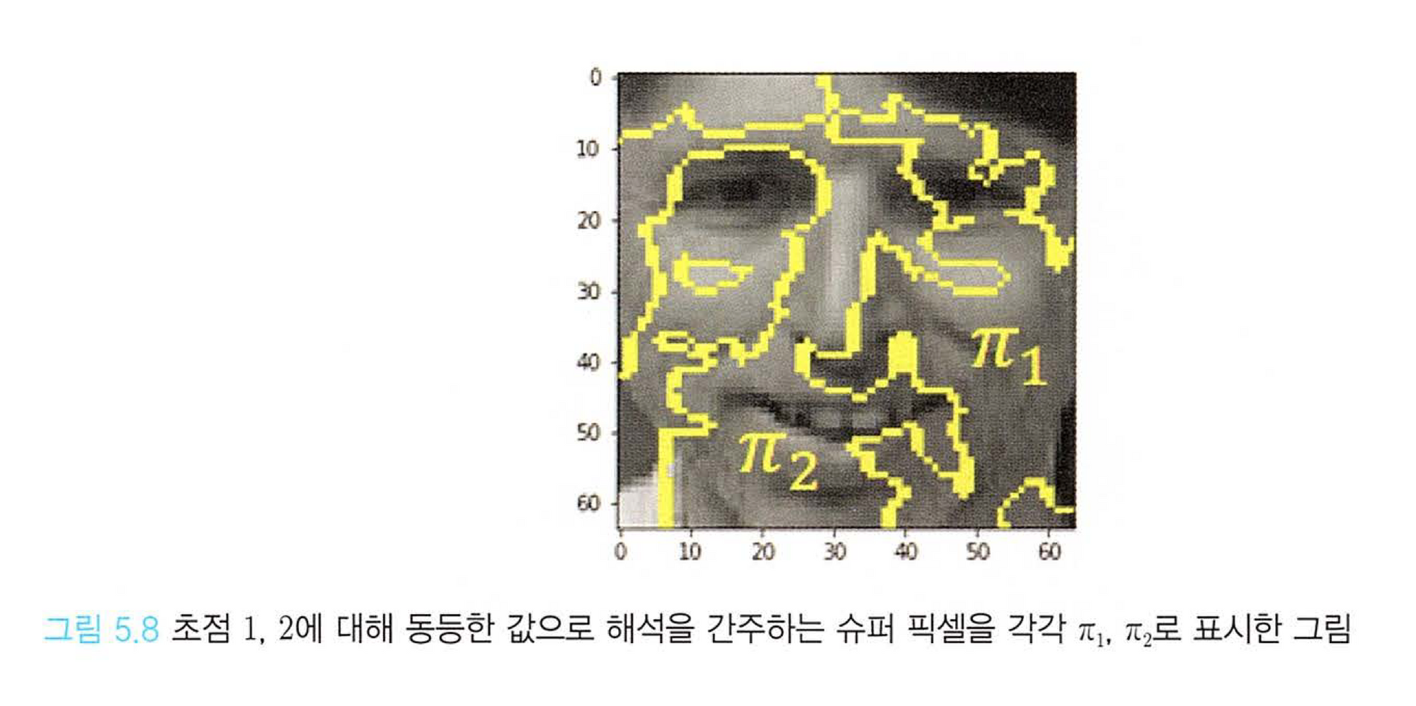 - 초점 주변으로 관심 영역을 키워나갈 때 기준 x로부터 동일한 정보를 가지고 있다고 간주할 수 있는 영역을 π(=슈퍼 픽셀)라고 함.