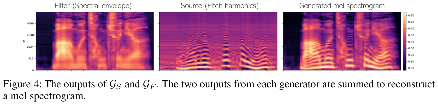 최종 멜 스펙트로그램 M̂은 두 생성기의 출력을 합산하여 얻는다.여기서,