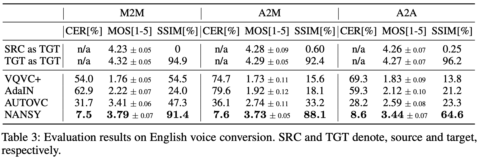 - NANSY가 모든 설정에서 선행 연구에 비해 CER, MOS, SSIM 측면에서 뛰어난 성능을 보였다.