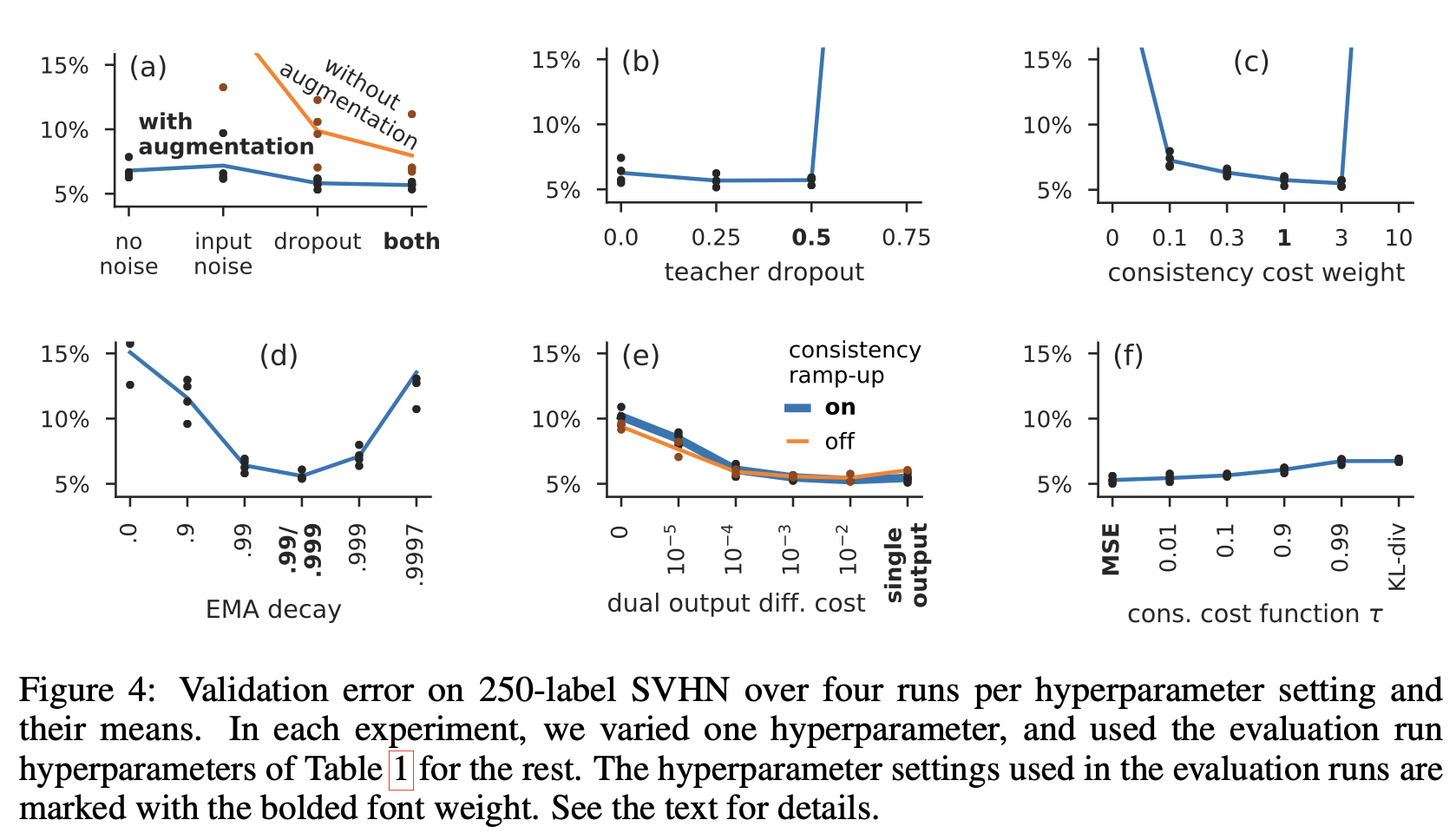 - 다른 기법에서 쓰이던 input noise와 dropout을 mean teacher에도 적용해야 하냐? 라는 질문에 그렇다 라고 대답할 수 있겠다. (a)를 보면 두 가지를 같이 썼을 때 에러율이 더 낮게 나타나고 있다. (augmentation도 효과적이었음을 보여주고 있다)