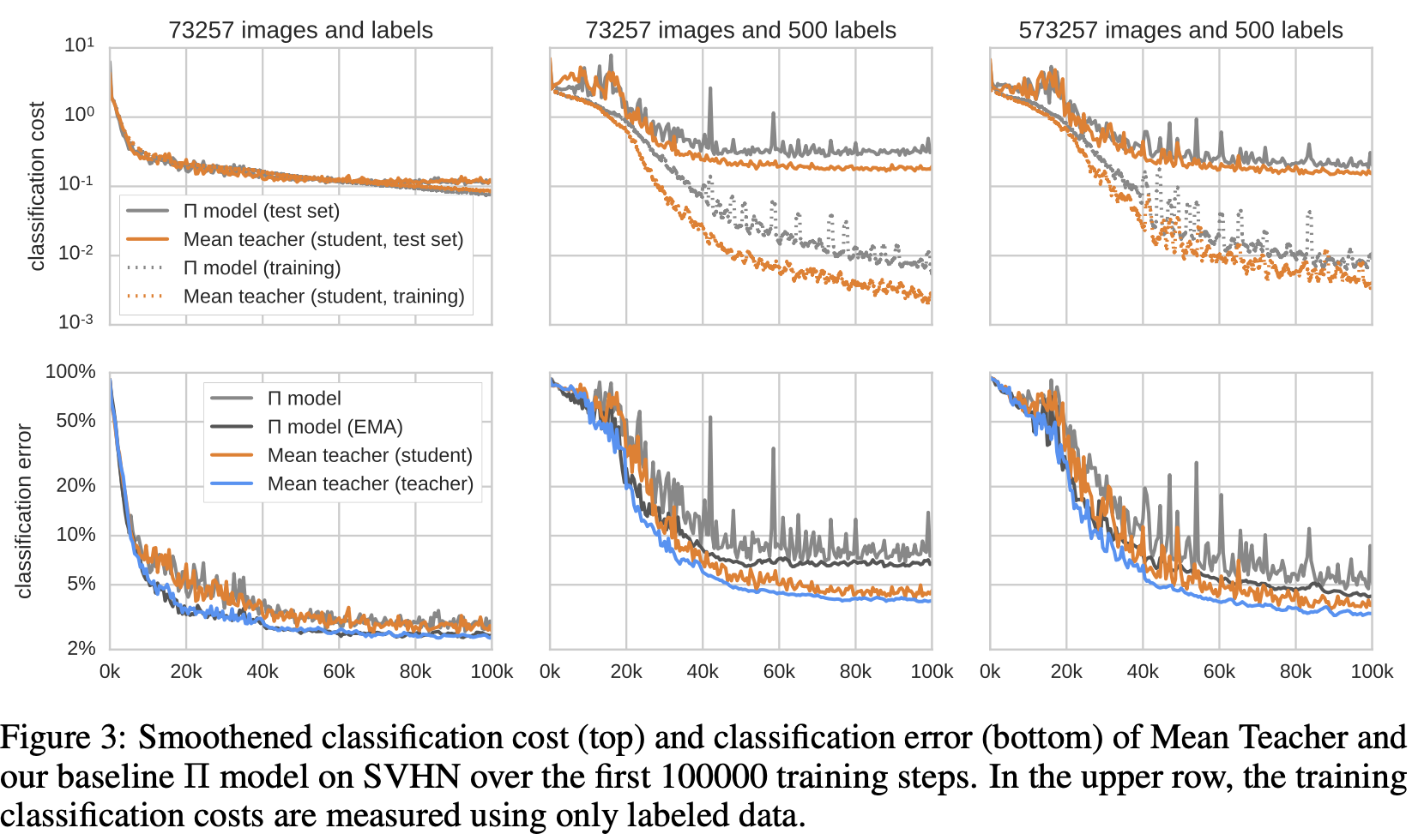 또 위에서 teacher model이 EMA 기반으로 업데이트되어 student model보다 안정적이라고 이야기했는데, 실제로 아래쪽 그래프를 보면 student model보다 teacher model이 에러율이 더 낮은 것을 볼 수 있다.