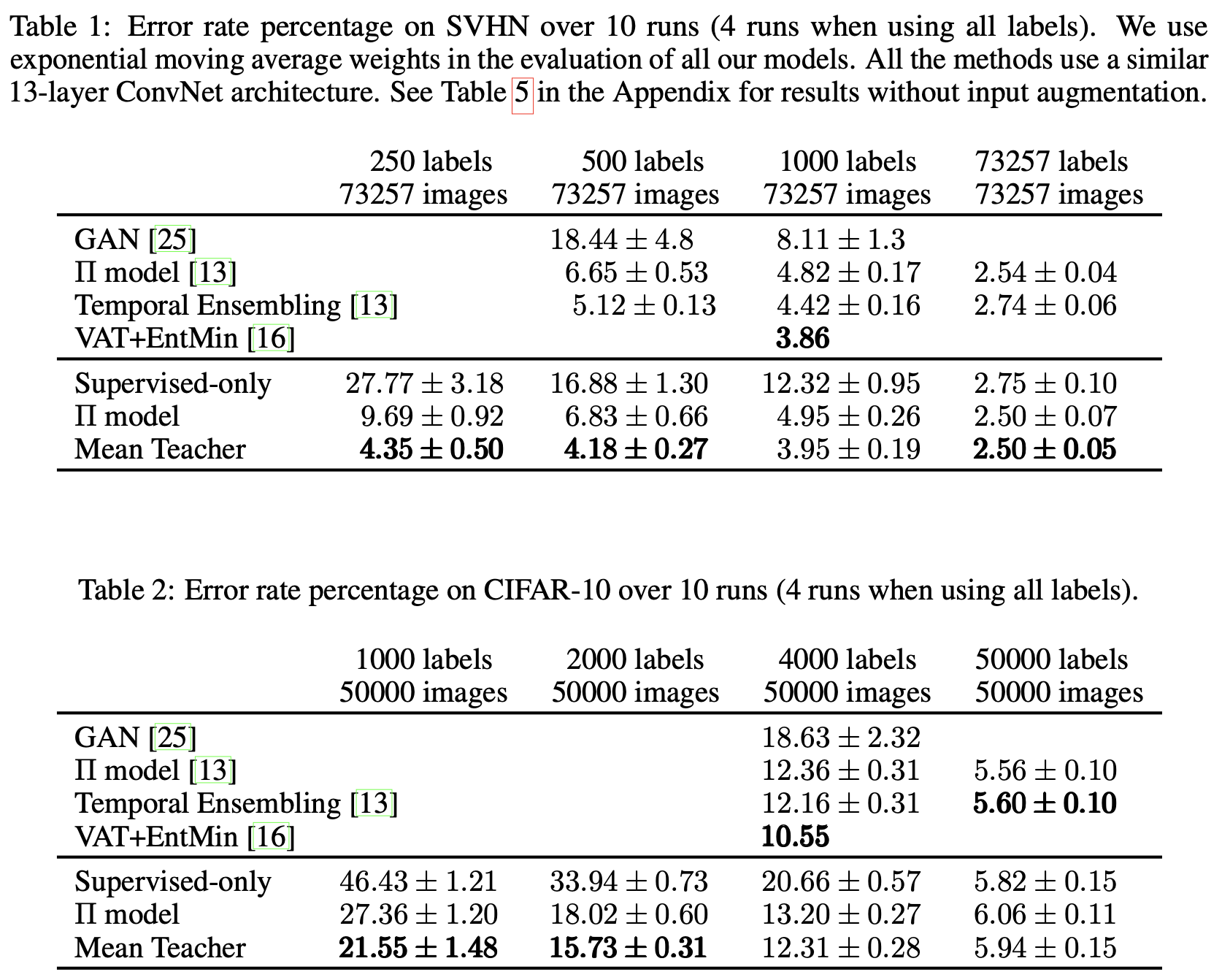 성능은 물론, Temporal Ensembling과 비교할 때 1)이전 에포크의 모든 예측값을 저장해 둘 필요가 없고, 2)가중치는 타임스텝마다 그때그때 업데이트 되므로 대규모 데이터셋을 다룰 때나 온라인 학습에도 훨씬 효율적이다.